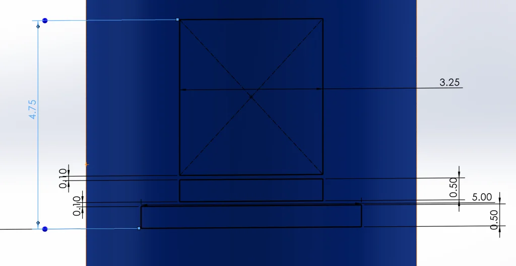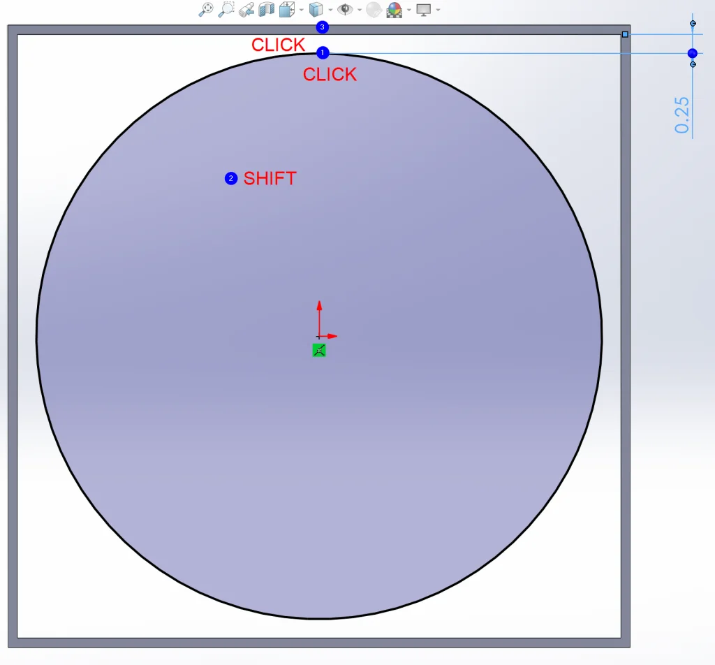 This will be our “square.” To create our “circle” we will also use an Extrude with Thin Feature checked, but to capture design intent with out dimensions we can use a trick. Usually Smart Dimension will dimension from the center of a circle to another entity, but in this case we want the measurement from the outer edge to the inside of the box. To do this, we can (1) activate Smart Dimension and select the circle, (2) hold down Shift, and (3) click on the inner edge of the box.
