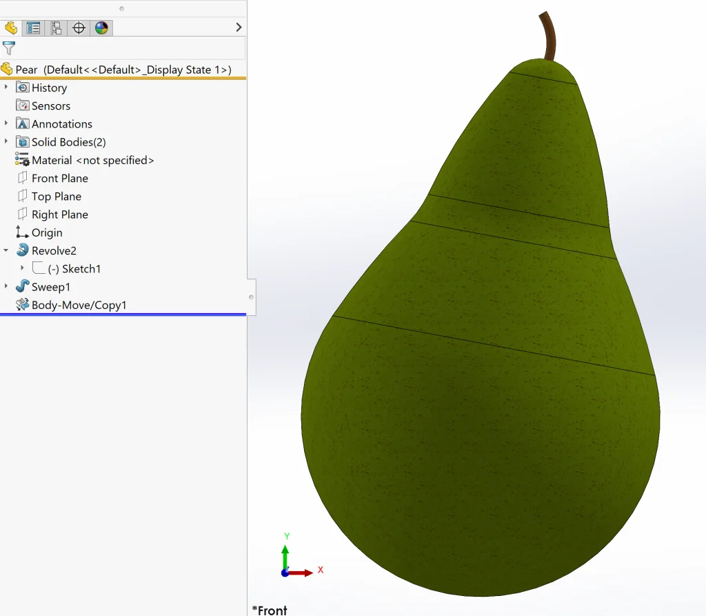 Creating the pear was simple – all I did was draw a profile, Revolve, sketch a stem and Sweep it out using a circular profile (that I didn’t have to draw), and then, for artistic effect, I used Move/Copy Bodies to add a tilt using the Rotate feature.