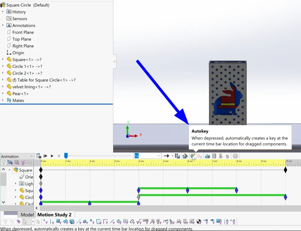 Alright, now it’s time to make some MAGIC happen with an animation. We start my creating a new Motion Study and selecting the type as Animation on the left. From here, I like to make sure that Autokey is turned ON. This will allow us to click on a time in the time line and move a component to automatically create a new step in our animation.