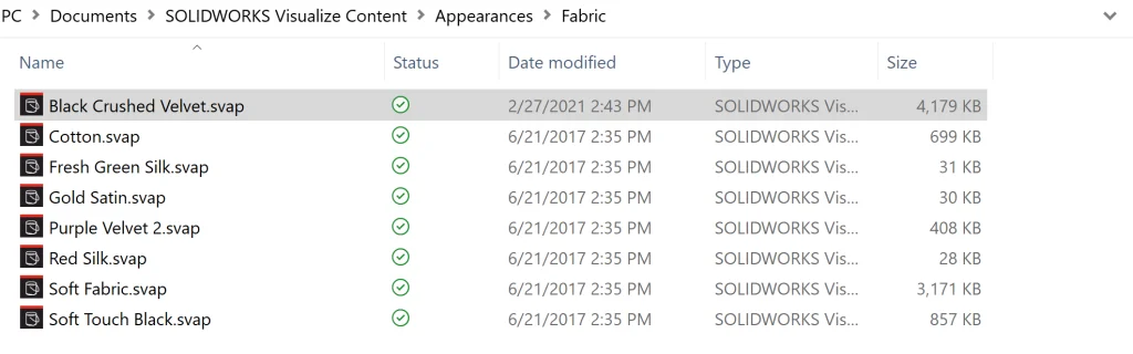 Actually, opening up Visualize Premium, I realized that velvet doesn’t exist here either by default. Luckily, there’s a GIGANTIC online database of additional appearances, scenes, etc. on MySolidworks.com. I did a simple search and found some black crushed velvet immediately (here’s the link). To add it to our library, all we need to do is click to download it and then move the file to your default location or, most likely, something like “C:Users