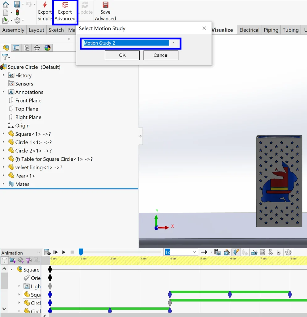 Ok, so back to business – we want to get our entire assembly along with the animation we just created into SOLIDWORKS Visualize. Sounds like a lot of work, right? Nope. It is never a lot of work. Here’s the trick – the SOLIDWORKS Visualize Add-in and Export Advanced. (Thank you, developers, for making everything so easy!)
