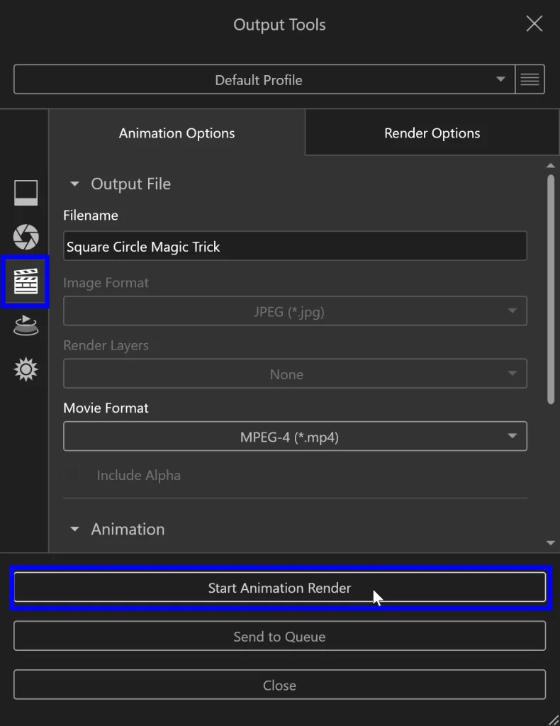 From here, we want to select to output our Animation on the left and then we can give our file a name and tweak settings like FPS. We can also change our render settings on the second tab.