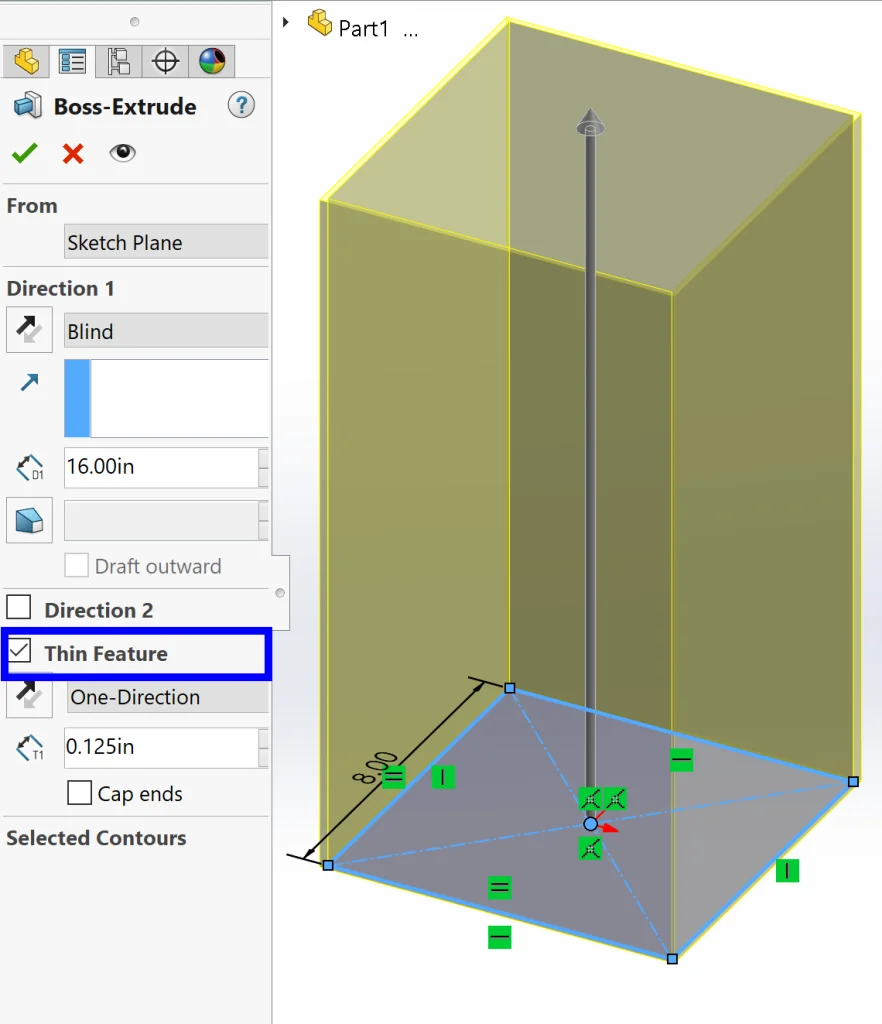 Let’s get started with some simple extrudes. To make life easier, I used the Thin Feature checkbox to get some thickness to my shapes without sketching an offset.