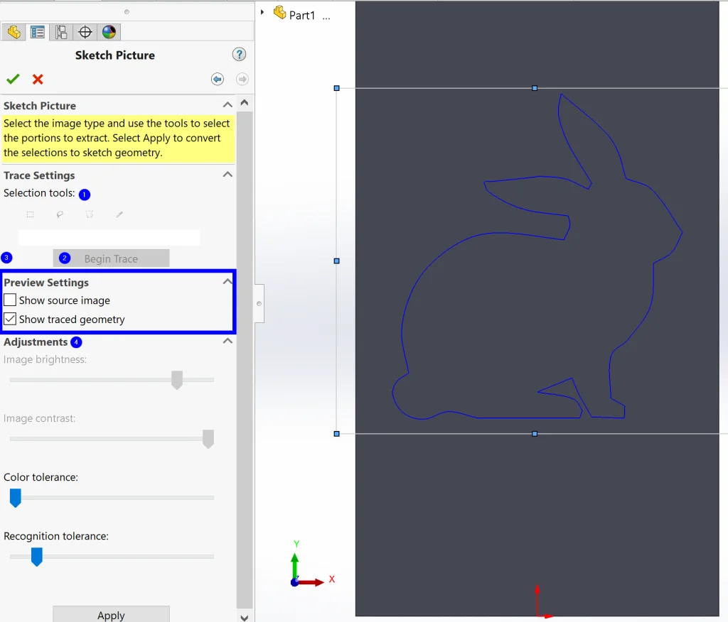 From here, we (1) use a selection tool to select the part of our picture we want to trace, (2) click Begin Trace, and (3) un-check Show source image to see our resulting geometry before (4) making adjustments until the image looks just right.