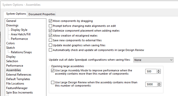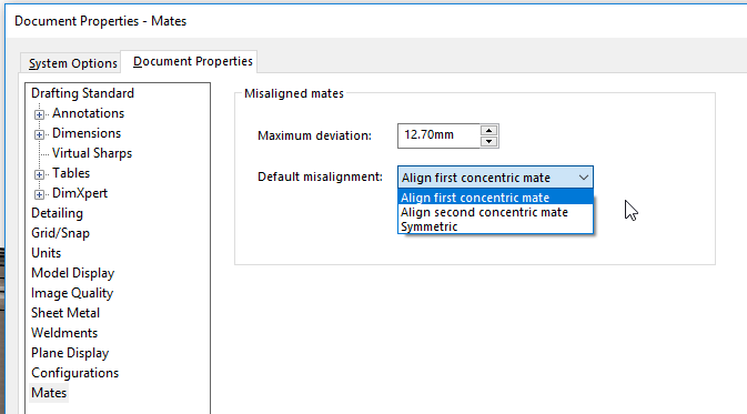 Setting the maximum deviation is easy enough. You can do it for the entire document in Tools > Options > Document Properties > Mates. You can also specify the default mate behaviour – ‘Align first concentric mate‘, ‘Align second concentric mate‘, or ‘Symmetric‘.