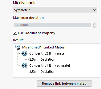Or you can apply a value to a specific mate. After applying the Misaligned mate, edit either of the linked concentric mates (click on it in the Feature tree and select ‘Edit feature’ from the pop up menu)>Untick the ‘Use Document Property’ and then specify the desired value in the Maximum deviation box.