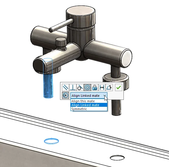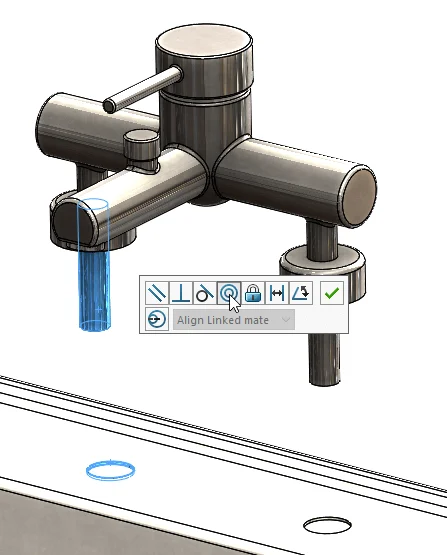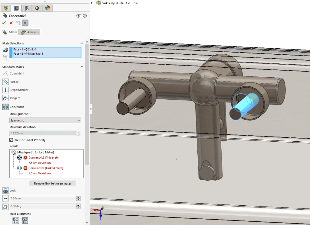 There is one thing to note however -While this is an excellent and (by some) long awaited addition to the mating system, it is not fool proof. There is the provision of a ‘Maximum deviation’ within the properties (the default value being 12.7mm) so you can set that to help avoid interference. If set correctly the mate will error if the combined deviation is greater than the maximum set. In this case the holes in the sink have been set at a centre to centre of 135mm resulting in a deviation of 7.5mm per hole, a total of 15mm causing the mates to error: