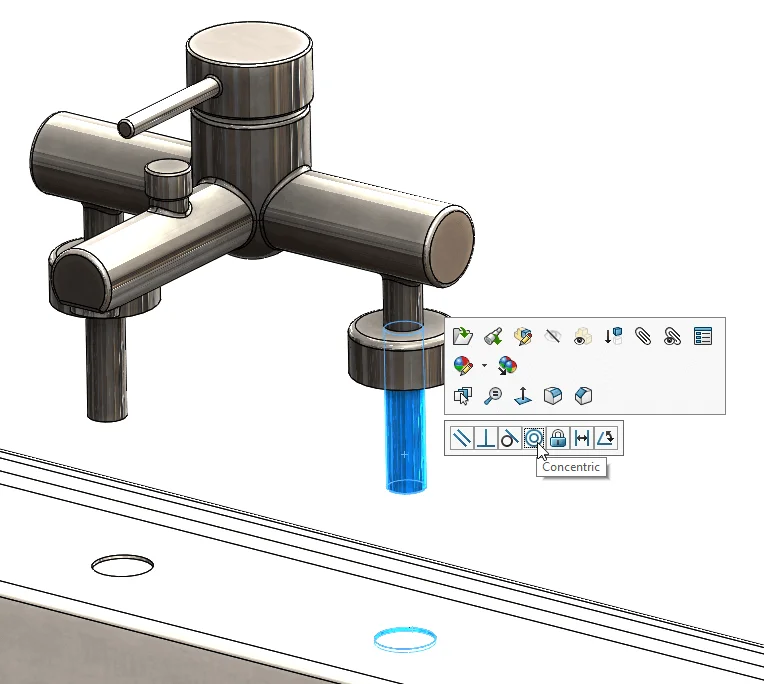 An example of this could be imported, or “bought in” components, where modifying the centre to centre dimensions is not viable. Let’s look at an example of a sink and a mixer tap, where the holes in the sink are 145mm centre to centre, while the tap is 150mm centre to centre. In terms of absolutes, there is a 5mm disparity between tap pipe and sink hole centres. Prior to SOLIDWORKS 2018 fully defining the two components via concentric mates would be impossible and a workaround would have to be employed.