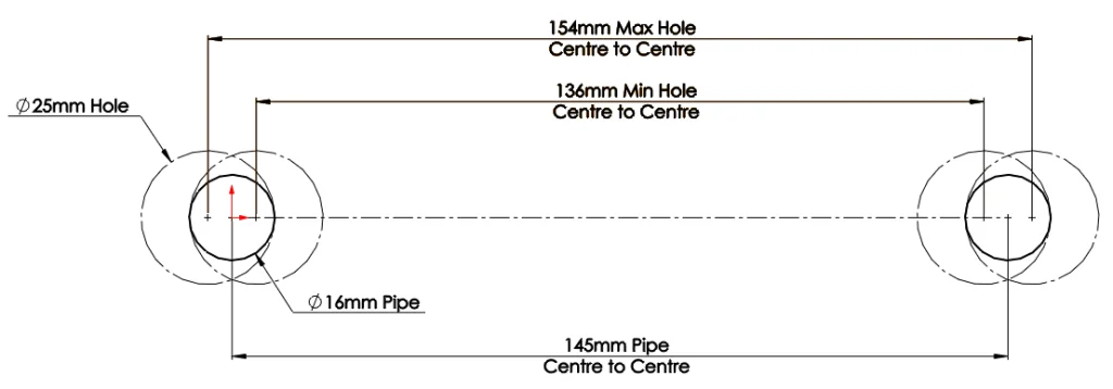 However, in reality a 16mm pipe in a 25mm hole means you can move the pipe up to 4.5mm off centre in any direction: