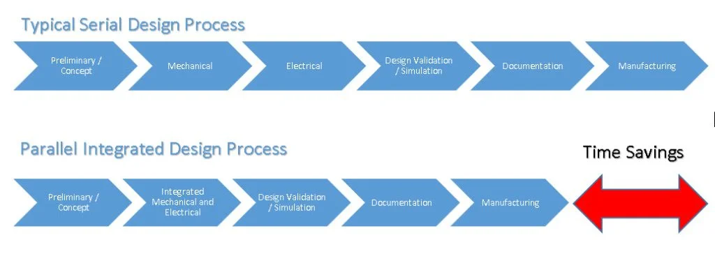 Users of the SOLIDWORKS product suite enjoy immediate fully associative change updates without time-consuming and error-prone translations. It is clear that using the same principals, our integrated mechanical, electrical and electronic solutions will allow for much more efficient collaborative design process and empower our customers to develop electro-mechanical systems faster by working more in parallel rather than a traditional serial process. The future is now using proven methods from the recent past.