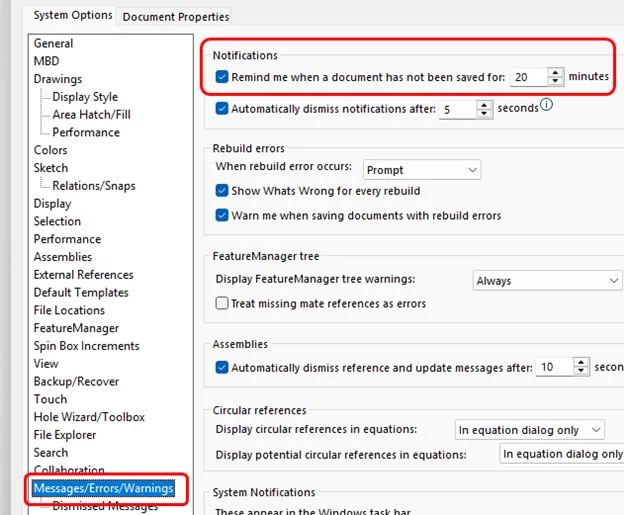 SOLIDWORKS doesn’t have an auto-save. It has what I like to call an “auto-nag.” The software will display a small bubble that reminds you to save at regular intervals. How often do you want to be reminded? How much work are you willing to lose? By default, you will be reminded every 10 minutes. Many users find that too distracting, so you can adjust that to every 15 minutes or every 30 minutes.