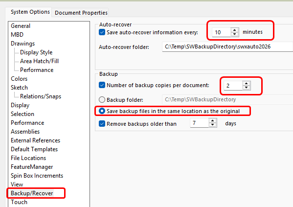 At the same time, you want to visit the Backup/Recovery options. SOLIDWORKS also has an auto-recover setting.