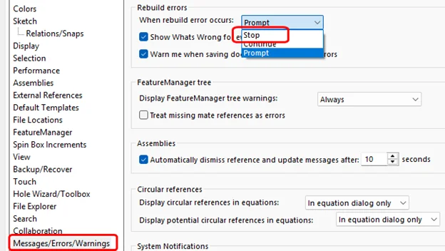 Go to Tools > Options. Highlight the Messages/Errors/Warnings tab in the left panel. Under Rebuild Errors, set the drop-down to stop when a rebuild error occurs. This means SOLIDWORKS will stop the rebuild and require you to make the proper repair before work can proceed. You may find this change annoying at first, especially when working on large, complex assemblies, but it will save you time in the long run, and you will learn where the “gotchas” are in your design.
