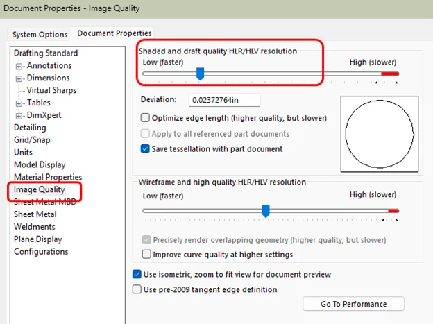 Slide Shaded and Draft Quality HLR/HLV slightly left (not all the way). Keep it moderate unless you’re doing render-level visuals. The default settings are often higher than necessary and can slow large assemblies.