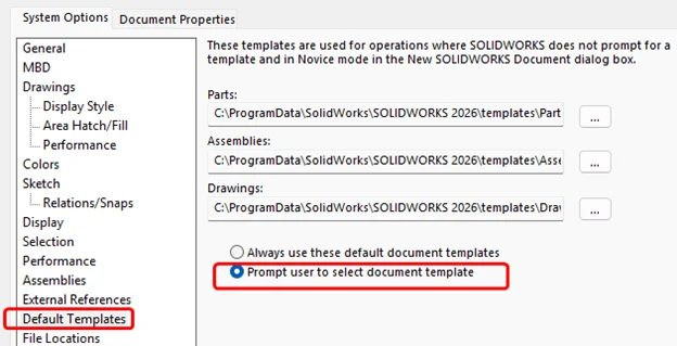 I normally have mine set to Prompt user to select document template. This is because I constantly switch between clients and units (Imperial/metric). However, if I am in an office situation and only using a specific part, drawing and assembly template for all my projects, I will browse to the location for each template type and select the desired template.
