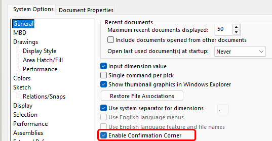 If you are missing the Confirmation Corner, go to Tools > Options. Open the System Options tab. Highlight the General tab and Enable Confirmation Corner.
