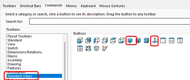 Highlight the Standard Views toolbar in the left pane. Drag and drop the default isometric view and the Normal To tools onto your toolbar.