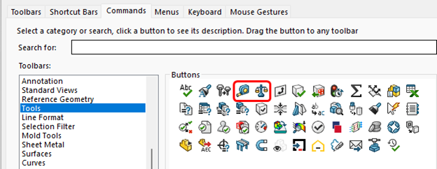 As long as you have this dialog open, highlight the Tools toolbar and drag and drop your favorite tools onto the Standard Toolbar. I usually add the measure and mass properties tool.