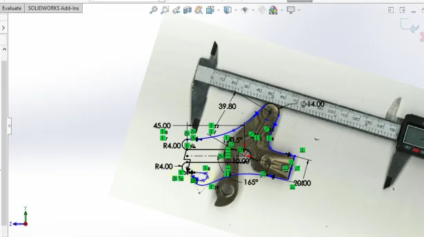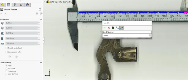 To start, I used one of my favorite sketch tools-Sketch Picture. As much as I like my calipers, I’d much prefer to figure out that bolt pattern with a good picture instead of measuring, typing, checking and repeating. Sketch Picture allowed me to take a picture and bring it into a SOLIDWORKS sketch, scale it, and then trace it. So, I scanned the current dropouts (it can be helpful to put a measurement tool in the picture)…