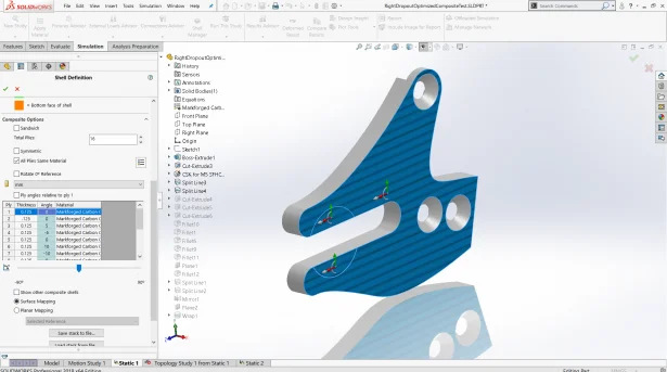 Enter SOLIDWORKS Simulation. Within Premium, I was able to define a shell face, enter orthotropic material properties based off of Markforged’s carbon fiber properties, and then play around with fiber angles. While this seems like it’d be a good idea for a Design Study, if you set the step size of each layer to 15 degrees from 0 to 180 degrees from horizontal, just 3 layers gets you 1,728 iterations. For 100? SolidWorks says no. Instead, I edited each layer’s angle in the shell definition. Initially I defined it as 48 layers of only 0-degree fibers (horizontal).