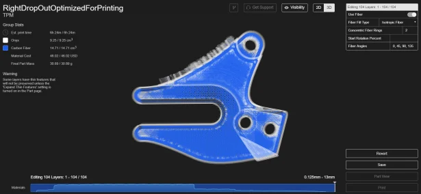 Where there’s an opportunity to specify, there’s an opportunity to optimize. With Markforged’s Eiger slicing software, we can specify not only things like fill density and wall/roof/floor layers, but also fiber direction for each layer. In this case, there were 104 layers. The obsessive side of me quickly starting driving all the other sides of me crazy.