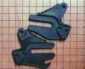 Test fitting them that evening showed one bolt hole was off by ~.4mm and the interface between the frame and the dropout itself wasn’t great. Not to mention that hook didn’t quite do what it was supposed to. A quick fix, and another print, but this time on the Markforged X7, as there weren’t any HP builds happening. While the X7 has the capability to print carbon fiber, and that is what I was shooting for, this second iteration was done just in Onyx, a material based on Nylon with chopped carbon fiber, which is much cheaper than laying continuous carbon fiber. Total cost: $6.51. The second iteration fit well and I was ready to go on to the final.