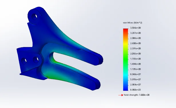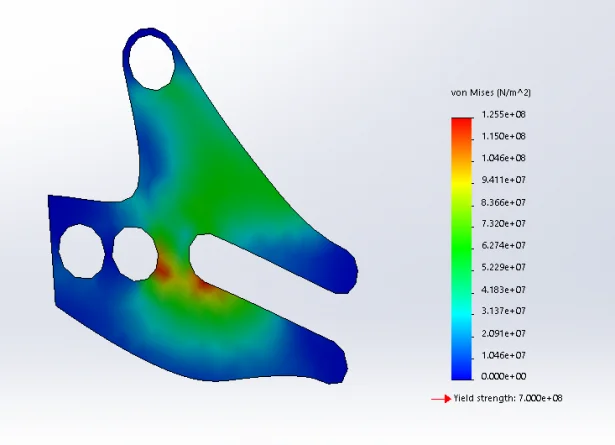 And so off to better with SOLIDWORKS Simulation. Before trying to figure out the best orientation of the fibers, I just wanted to see if I could improve the shape. So I applied an isotropic (same material properties in all directions) similar to the Markforged carbon fiber and defined my fixtures (the 3 bolt holes). I then made a worst-case scenario with the axle bolts at the end of the slot and applied my loads (250N on either side of the bolt, 320N, or half body weight, down). Finally, I meshed (curvature based with a max element size of 3.6mm) and ran. First thought: Good thing I didn’t just hit print.