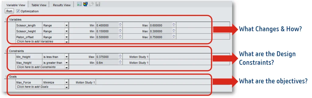 Next Optimization tools built within the tool set are used to illustrate how motion analysis serves as a design tool as well in addition to enforcing design constraints and goals. A medical couch example is used to highlight this powerful capability. The setup process is shown below.