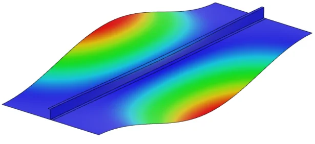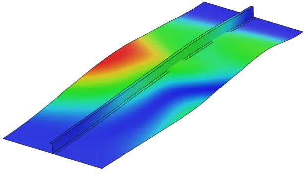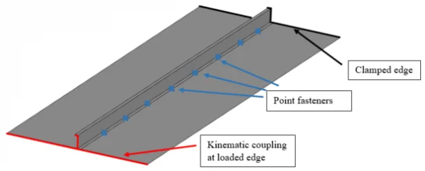 The panel consists of a thin rectangular skin of thickness 2 mm, length 600 mm, and width 220 mm. The skin is reinforced with a Z-beam stringer of thickness 1.6 mm, web height 25 mm, and flange width 20 mm. Since the thicknesses of the skin and stringer are very small compared to their other dimensions, the structure is modeled using S8R shell elements. Aluminum (Image = 70 GPa, Image = 0.3) with elastic-plastic material behavior is used for both parts. The stringer is fastened to the skin using point fasteners and kinematic coupling is defined at one edge of the panel such that the edges of the skin and stringer are coupled to a reference point. This reference point will be used to introduce force and displacement loading. The opposite edge of the panel is fully clamped. First, a linear buckling analysis is performed with a compressive load of 20 kN applied at the reference point on the loaded edge. The results indicate that the skin buckling load is approximately 18 kN. The buckled shape of the panel is shown in Figure 3.