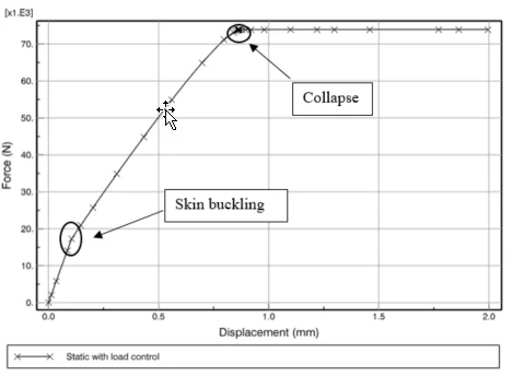 For comparison, the analysis is also performed using the static solver with stabilization to reduce inertial effects. In the static analysis, a compressive load of 100 kN is applied to the loaded edge. The load-displacement behavior obtained is shown in Figure 4. We can see that the skin buckles at a load of 17.68 kN as indicated by the slight kink in the response but the structure collapses at a much higher load i.e. approximately 74 kN. The buckled shape of the panel and the displacement magnitude contour is shown in Figure 5.