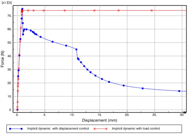 The static solver fails to provide a solution beyond a displacement of 2.0 mm. Therefore, we will perform a nonlinear buckling analysis using implicit dynamics with both load control and displacement control. For the load-controlled case, we apply a compressive load of 100 kN to the reference point on the loaded edge (similar to the static and eigenvalue analyses). For the displacement-controlled case, we apply a compressive displacement of 150 mm to the reference point. The force-displacement responses from both cases are shown in Figure 6.
