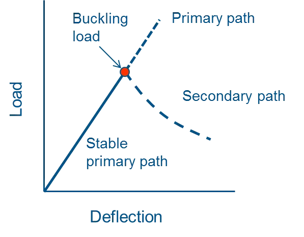 Buckling is a critical failure mode of structural components. It occurs when a structure loses its load-carrying capacity under compressive loading. The buckling load may be significantly lower than the ultimate stress needed to cause material yielding. This is why it is important to analyze buckling in safety-critical structures. When buckling occurs, the primary equilibrium path i.e. the load-displacement path experiences a bifurcation as shown in Figure 1. Beyond the bifurcation point is the secondary equilibrium path where the response of the structure may be highly nonlinear. This is the postbuckling regime.