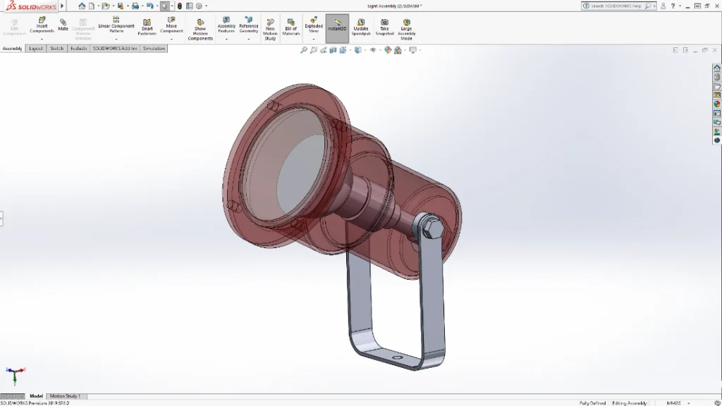 3D CAD model of the lamp assembly in SOLIDWORKS