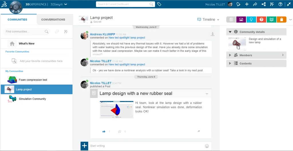 Communities let you exchange with your colleagues, partners, customers, suppliers, as you would do in any social media platform. The difference with 3DSwym Communities is that this is secure and only invitees can access to it. This is also in 3D, so you can publish pictures of your 3D design or simulation. It is a great way to share ideas, pictures, and comments on your 3D model, ask questions and get quick feedback.