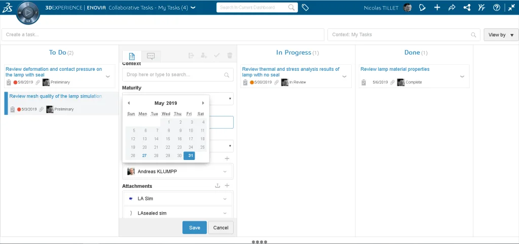 You wouldn’t be an engineer if you didn’t prefer solving problems over managing projects and tasks. Using the Collaborative Tasks app, in a few clicks you can create tasks, assign them to people, set an estimated finish date, and link them to a 3D model. You can simply drag the task to update its status. You can view all tasks or just the tasks assigned to you. You can add notes on the fly and upload related content. What’s even better is that you have the option to set automatic email notifications when an event occurs. For example, I have assigned a few tasks to myself to review the mesh quality of the lamp model and the thermal and stress simulation results. I can quickly see what tasks I have to do and move them to an in-progress or done status.
