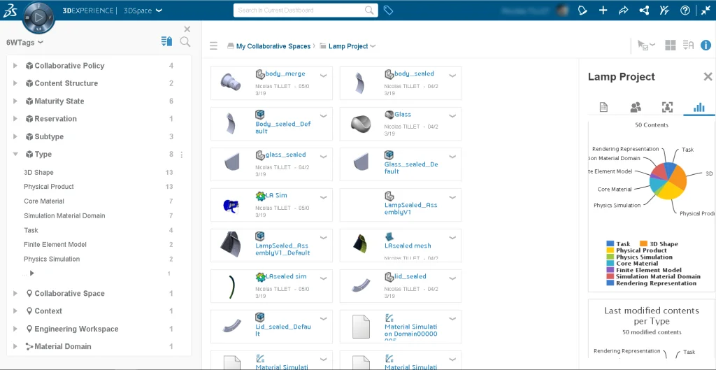 Managing and finding engineering and simulation data can be challenging. In fact, for an engineer, searching and finding the right engineering data can be a time sink. An advanced simulation tool such as SIMULIA Structural Professional Engineer, which runs on the 3DEXPERIENCE platform, saves all simulation models securely in a database making them easily searchable. The search tool, the 3DSpace app, finds the desired data by text and/or using a tag-based filter called 6W tags (checking for who, when, what, where, why and how). For example, I can search all simulations created by me last week in the Collaborative Space called “Lamp project.”