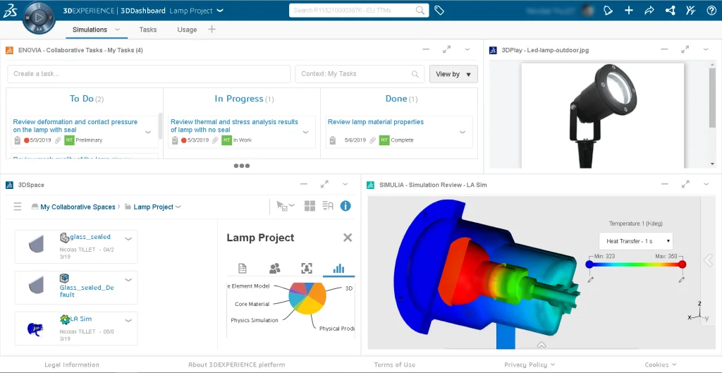 With the 3DDashboard web app, you can easily create a dashboard for use by yourself or to share with your team. Simply drag and drop, resize the content of predefined widgets the way you want. For example, for this new lamp project, I have created a 3DDashboard with three tabs. In these tabs, I have created different widgets to manage my tasks, to visualize images of my product, to search for my engineering and simulation data, to quickly view my simulation results and data and finally to keep track of my cloud computing usage.