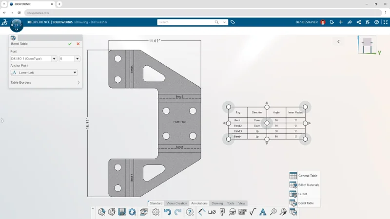 Communicate key manufacturing information such as bend order, direction, angle, radius, and more alongside your flat pattern with bend tables.