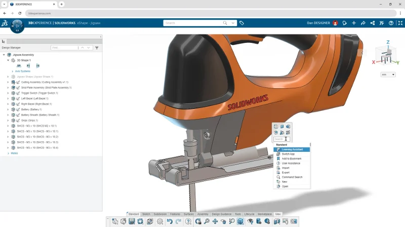 Find the tools you need fast! This is a favorite in SOLIDWORKS Desktop and now it’s available in the browser-based design roles! Quickly find and open commands with new options, including searching for commands through the S Shortcut menu, directly from the Action bar, or simply pressing the / key on the keyboard. You can search for commands by the command name, keywords in the tooltip description, or common synonyms from other CAD systems.