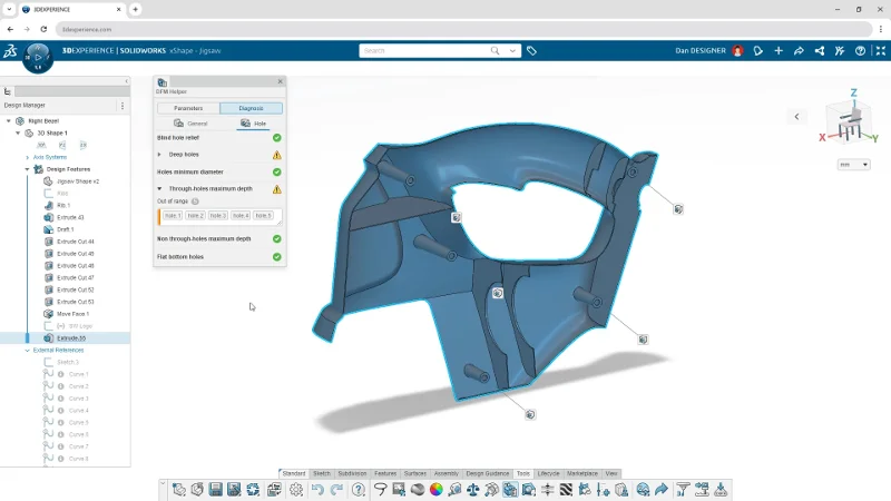For part and assembly design, there’s a new command called the DFM Helper that enables you to perform geometry checks for certain parameters such as maximum part size, minimum wall thickness, and hole specifications to ensure that designs are manufacturable. This new feature enables you to find potential errors early in the design process that could affect the manufacturability of your product, streamlining production workflows. With the DFM helper you can identify design flaws before they hit the shop floor!