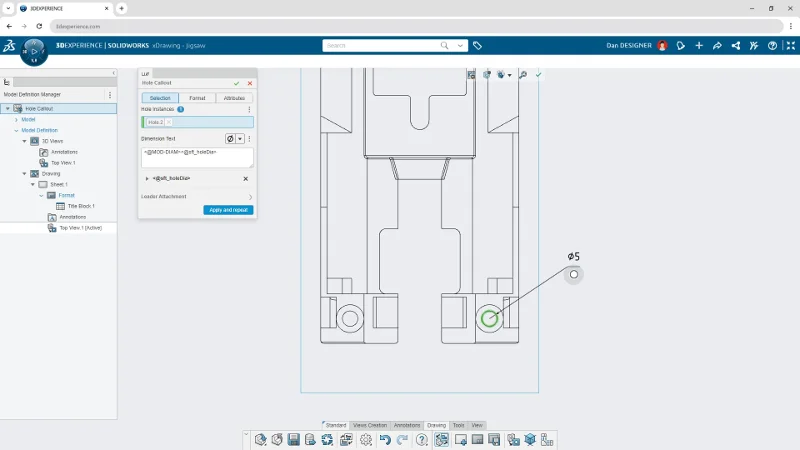 There’s a new Hole Callout tool that enables you to define any hole, or hole pattern that was created as a hole feature in 3D Creator’s xDesign app.