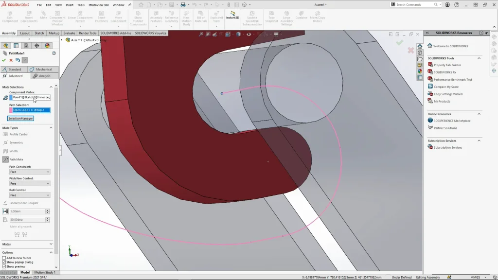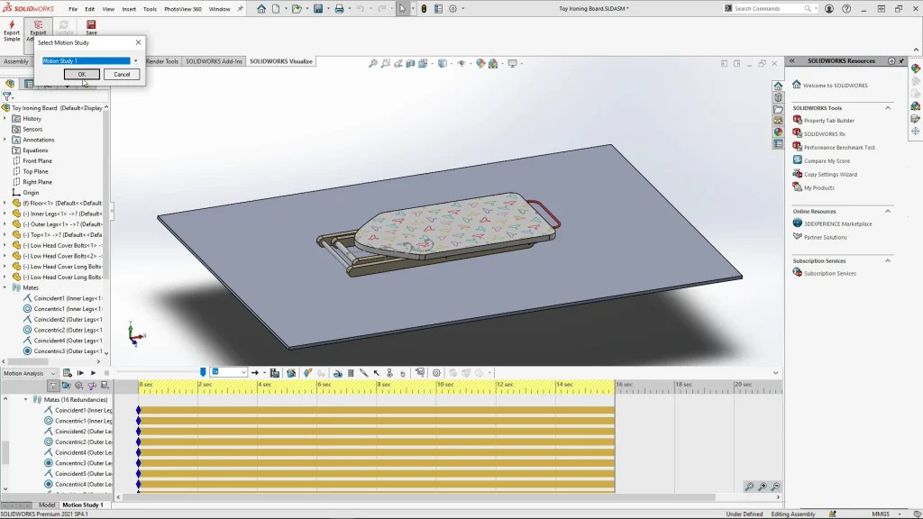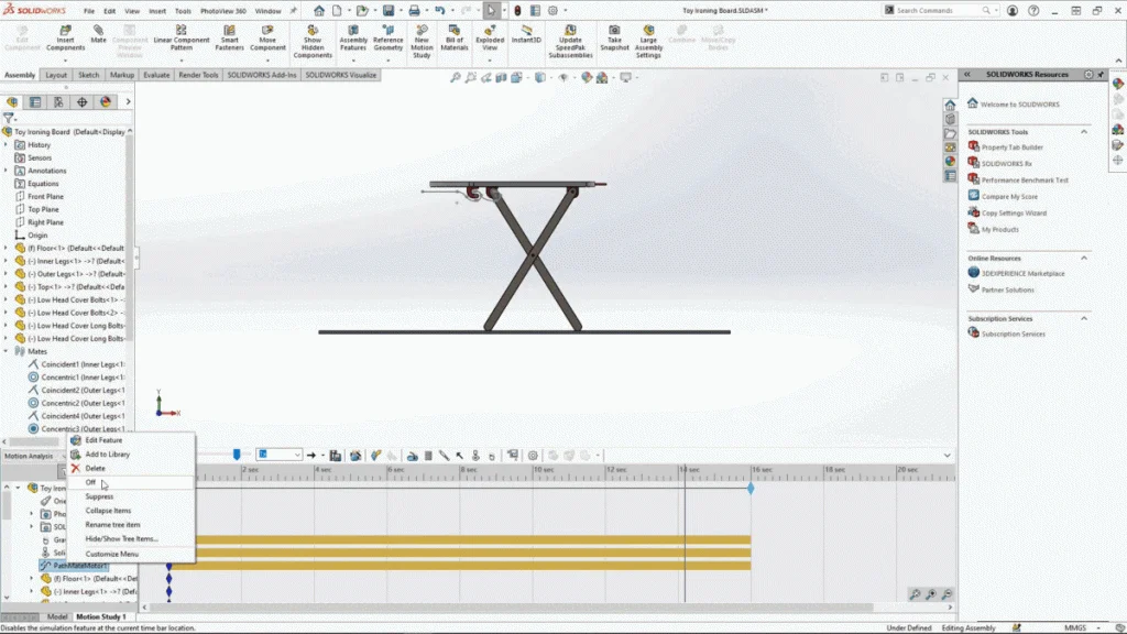 During the tutorial, I take you through the assembly of all the parts, I simplified the parts of the ironing board for the assembly by having main parts already connected, for example the inner legs are made up of two legs held together with two poles, I do this to simplify the assembly of a design, but also for motion study purposes, having fewer mated parts can speed up your calculations. It’s important to follow the mates I apply to the parts as they could affect how the parts can move, the legs are mated together with coincident and concentric mates at the screw holes, the concentric mates are left unlocked to turn freely, however when it comes to adding the custom screw fastenings, these need to be mated concentric with rotation locked. This again simplifies the motion study as the screw parts are fully defined within the moving parts, the legs can move on the screws, but the screws will not turn.