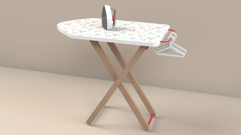 I have designed ironing boards in the past as a toy designer, and something I would have to test for is how the toy would open/close, and at what height it would be for a child to play with the toy. On occasion for toy buyers or even for the toy factories to use and refer to, I would need to create an animation to illustrate how a toy should work, this is useful to them, but also for myself to ensure the design works. The rendering below of the full assembled ironing board also includes some accessories, you can download the files for the tutorial assembly here