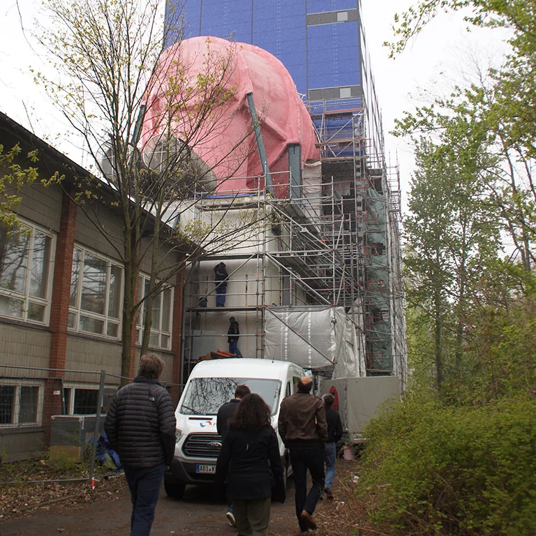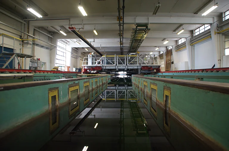 Our first stop could not be missed. As one of the largest water tanks in the world for testing ships, propellers and hulls, the bright pink and blue structure towered over the campus.