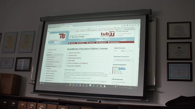 We spoke with the PhD candidates of fluid mechanics and technical acoustics. The historic conference room was filled with awards from AIAA, ASME and other organizations along with engineering dissertations over 100 years old providing us the technology that we use everyday. The students explained how the SOLIDWORKS Student Engineering Kit (SEK) can be distributed to all students through the TU-Berlin web portal for free, providing CAD, FEM and CFD software tools.