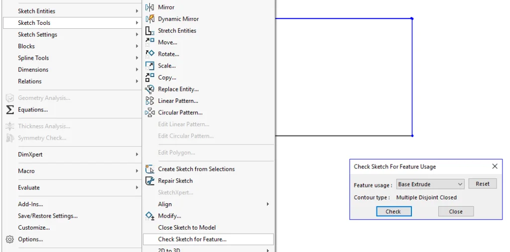- Check Sketch for Feature. This tool gives a list of all the features we would want to use a sketch for, and tells us what the requirements of that type of sketch are. For example, when extruding for a base extrude it requires a Closed Contour (multiple/disjoint supported) this helps identify where the problematic areas are within the sketch.