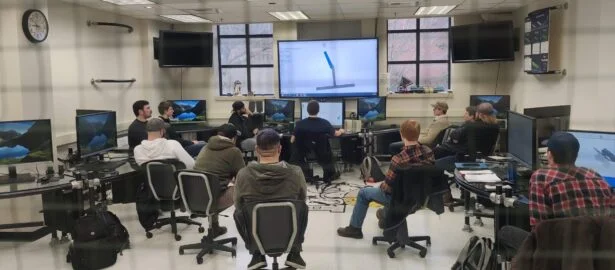 In the advanced Solid Modeling, Simulation, and Manufacturing Capstone course, the layout of the classroom plays an important role in facilitating the learning process. The room was intentionally designed with a number of features that help students interact and engage with fellow students and mentors. The figure above shows ME 490 Mentor Christian Vega using a large instructional monitor to provide demonstrations to students.