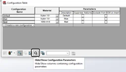 To see all the Configuration Parameters used on a Part/Assembly, click the Hide/Show Configuration Parameters button.