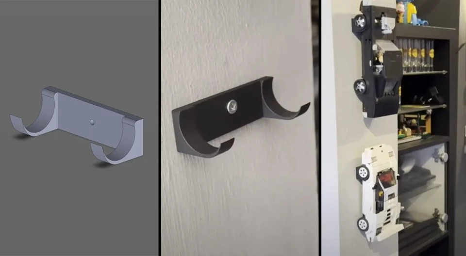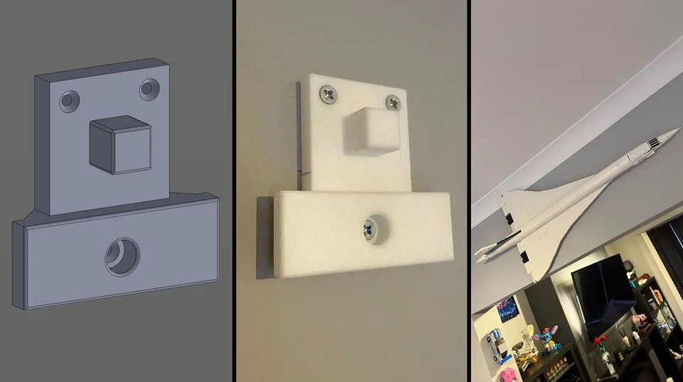 Next up was my LEGO Concorde set. This one posed a challenge because of its size and sleek design. I wanted the mount to hold it safely while still keeping the plane’s profile clean against the wall. Using SOLIDWORKS I created a custom mount that was inspired by the table stand that you build with the set. Just turned 90 degrees and some extra support to distribute the weight into multiple contact points. Pair this with a strong SLS Nylon 3D printed part, I ended up with a solution that looks almost like it’s floating.
