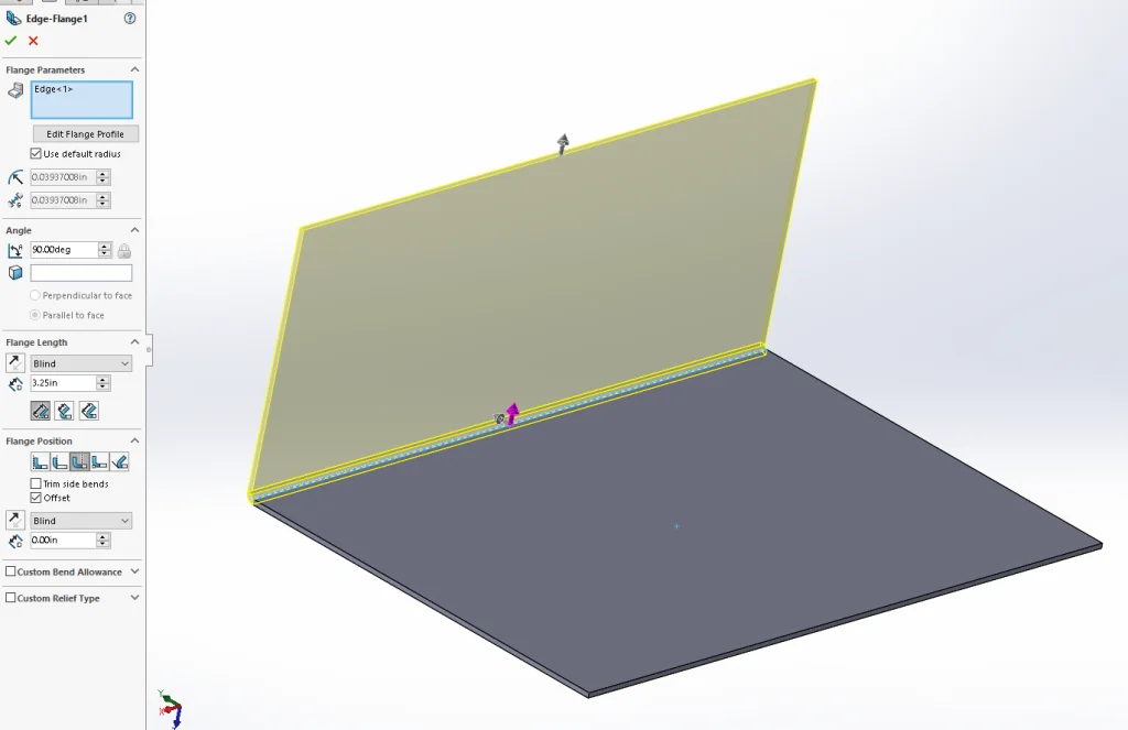 To add the sides to the box, the Edge Flange tool was used. One edge of the base flange is selected as the flange profile and a variety of parameters are set such as angle, flange length, and flange position.